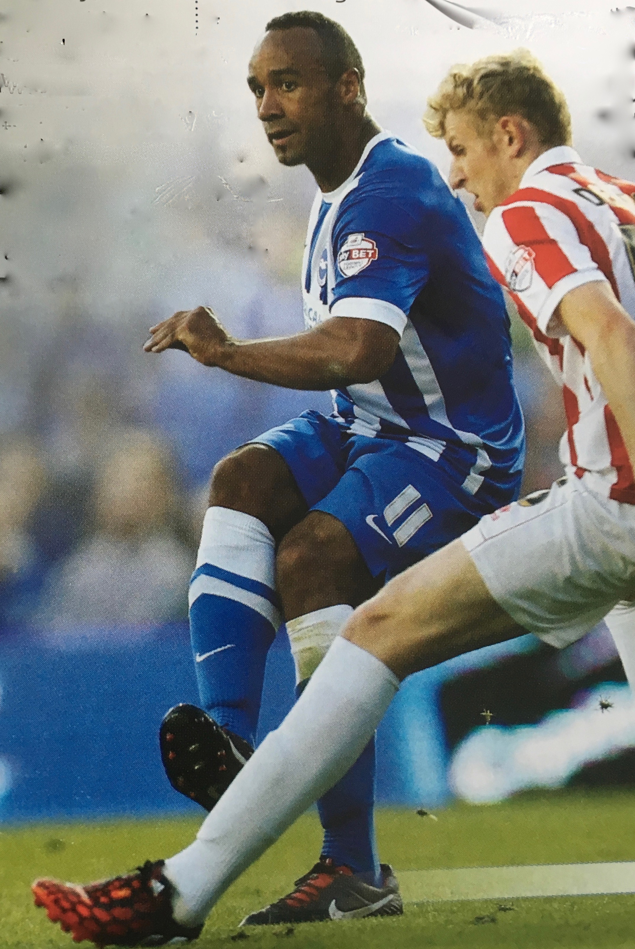 In the last year of his Albion contract, 2016-17, he was reunited with Nigel Clough, this time at Burton Albion, (pictured in action below) where he scored once in 26 games. While he was a regular in the first half of the season, he made only five appearances after the turn of the year following the arrivals of Cauley Woodrow, Luke Varney and Marvin Sordell.