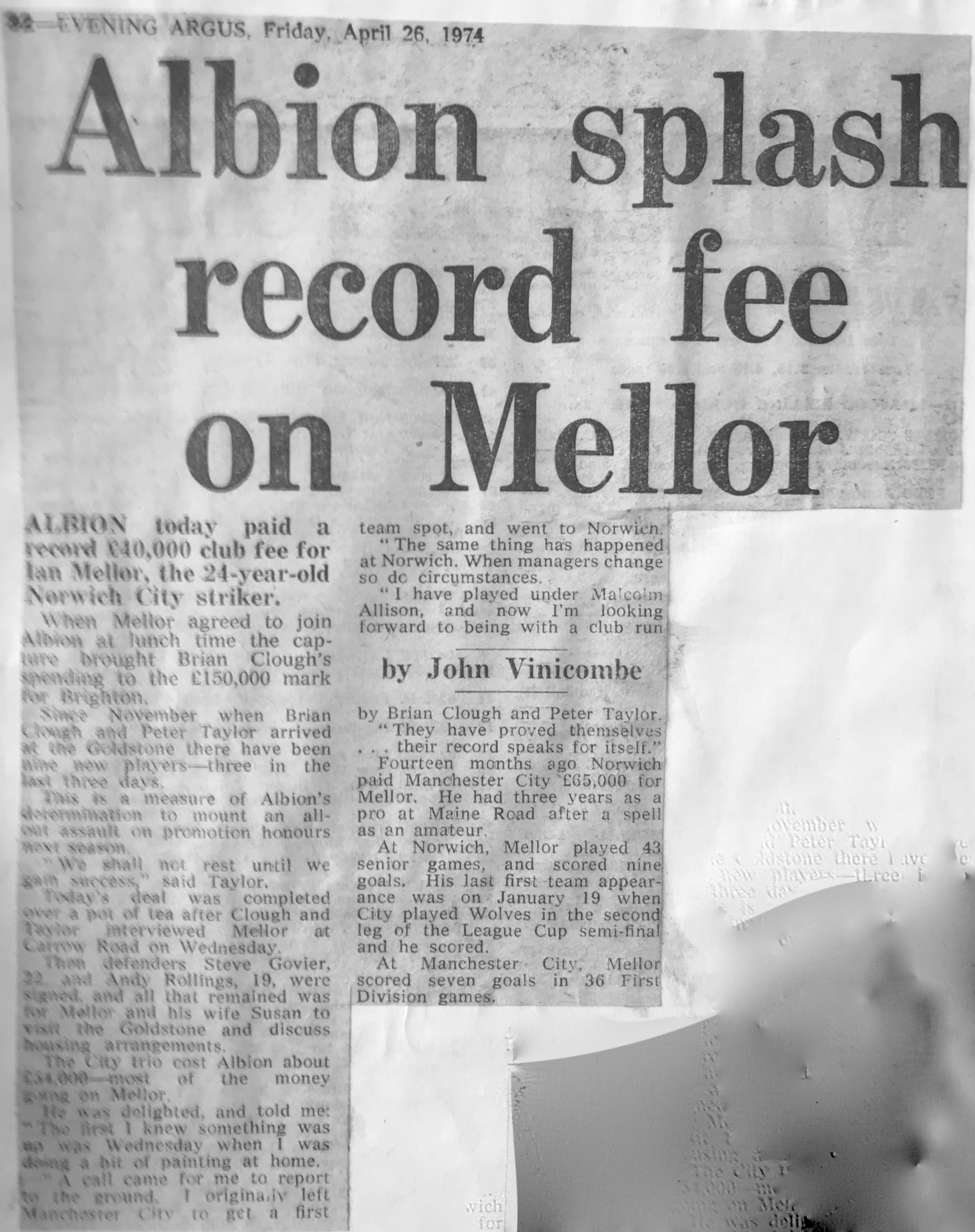 Signed for Brighton by Brian Clough for what at the time was a record £40,000 fee for the club (fellow Norwich youngsters Andy Rollings and Steve Govier joined at the same time), the opinionated manager had quit for Leeds before Mellor had kicked a ball in anger for the Albion.